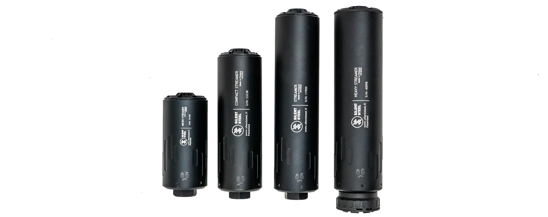 There are four sizes, from the left: Micro Streamer, Compact Streamer, Streamer and Heavy Streamer. The Heavy Streamer is shown with the Quick Detach Lock (QDL) attachment, the others are all Direct Thread (DT).