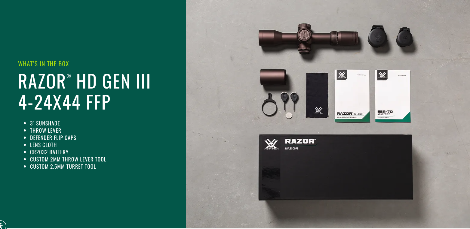 Trusted by elite shooters, the Vortex Razor HD Gen III 4-24x44 FFP delivers the versatility needed for Target/ Hunting operations. Its low magnification and wide field of view ensure fast observation and close-range shots, while high magnification provides precision for long-range target identification. With a compact, rugged design that minimises weight without sacrificing performance, it offers top-tier optics and unmatched reliability when it matters most.